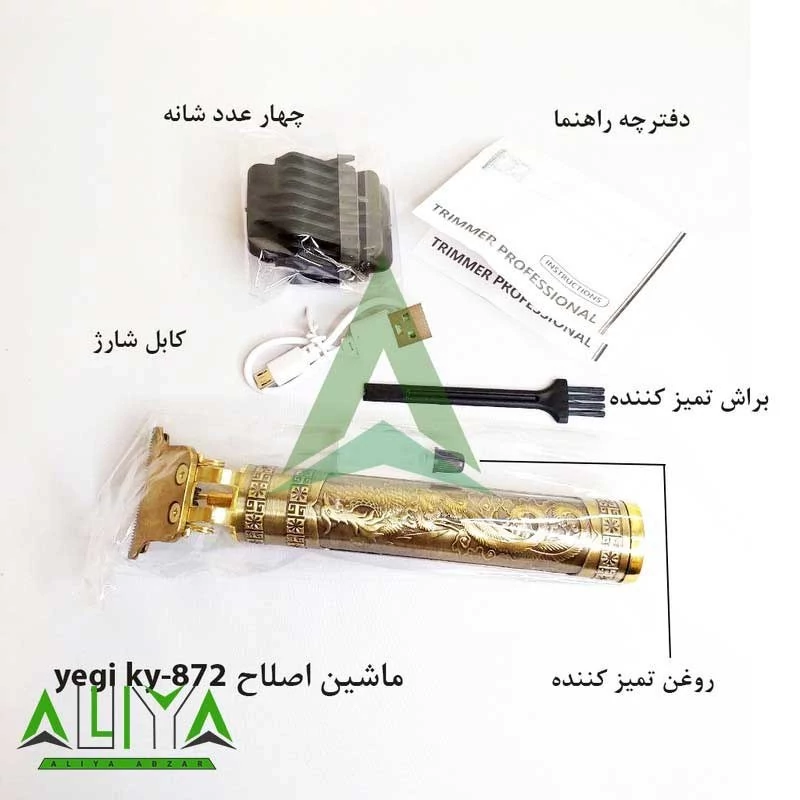 ماشین اصلاح موی صورت مدل KY-872 از سری ماشین اصلاحهای حرفه ای با کیفیت است که با طراحی خاص و ارگونومیکی که دارد میتوان برای اصلاح مو در منزل و در مسافرت از آن استفاده کرد. ظاهر این ماشین اصلاح نیز طراحی خاصی دارد و دارای نقوشی از اژدها و سیمرغ است که باعث شده از سایر محصولات مشابه متمایز شود. تیغه این ماشین اصلاح موی صورت از جنس استیل ضدرنگ است و توانایی اصلاح به صورت خطی و نزدیک به صفر را با مدرت پر قدرت دارد. باید توجه داشته باشید که مانند یک ریش تراش نمیتواند عمل کند و عملکرد آن نزدیک به اصلاح صفر است. ماشین اصلاح موی صورت مدل KY-872 دارای چهار شانه 1.5، 2، 3 و 4 میلیمتری است و همراه با آنها یک فرچه برای تمیزکاری نیز ارائه میشود